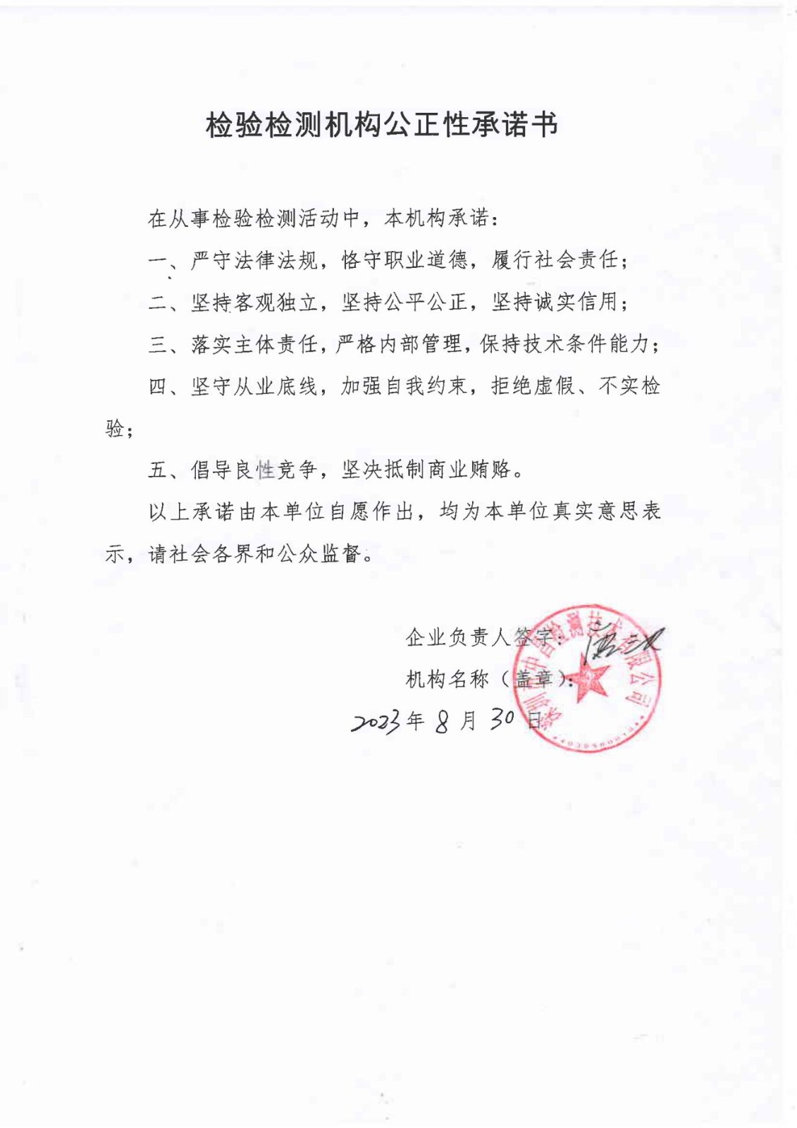 檢驗檢測(cè)機構公正性承諾書