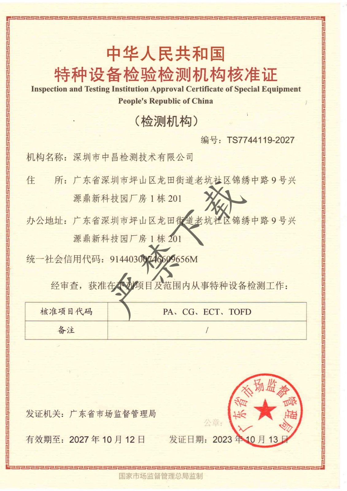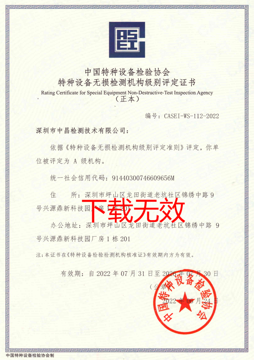 特種設備無(wú)損檢(jiǎn)測機構級別評(píng)定證書
